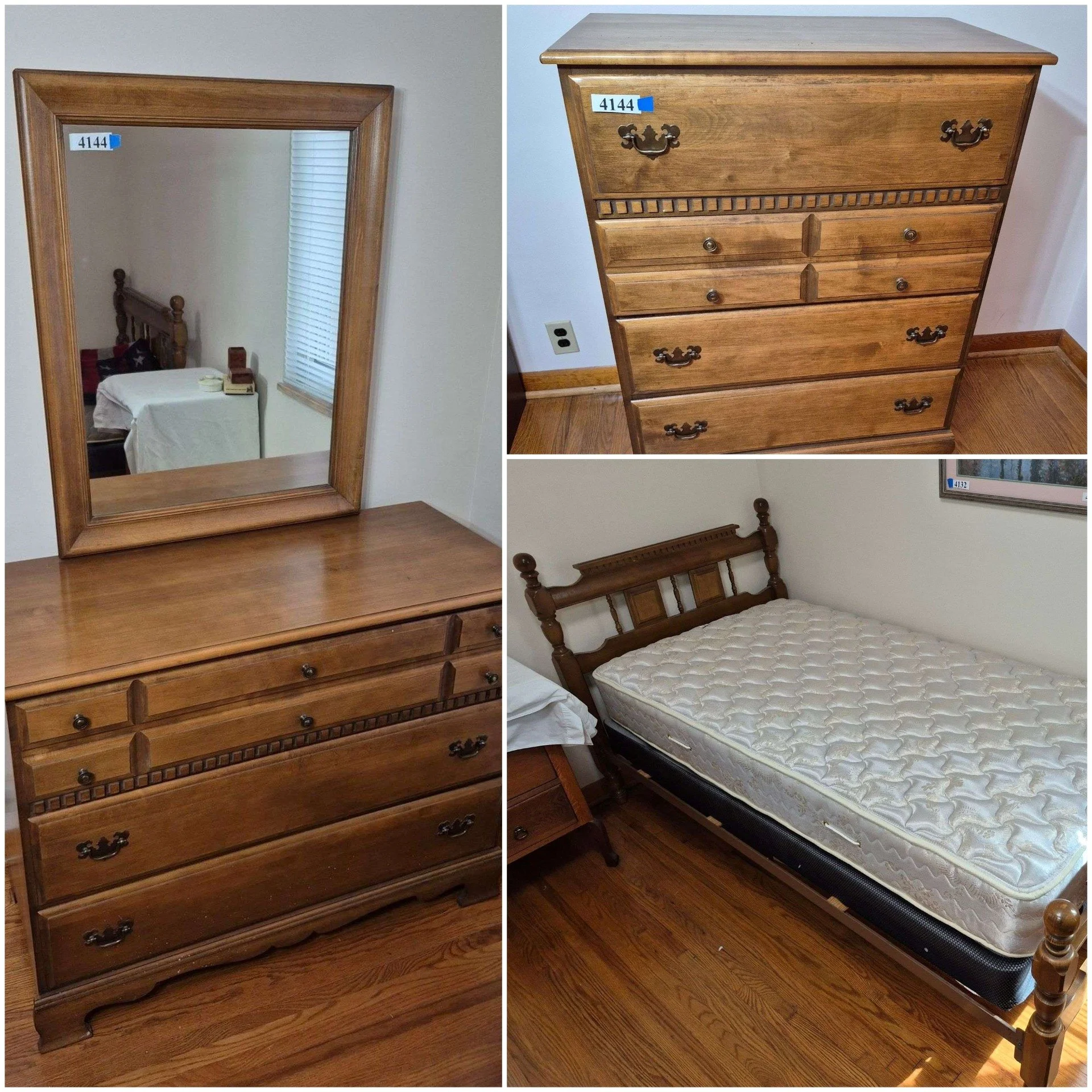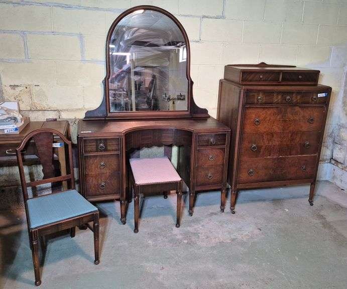 4296 Depression era chest of drawers, vanity with mirror, bench, and chair.
