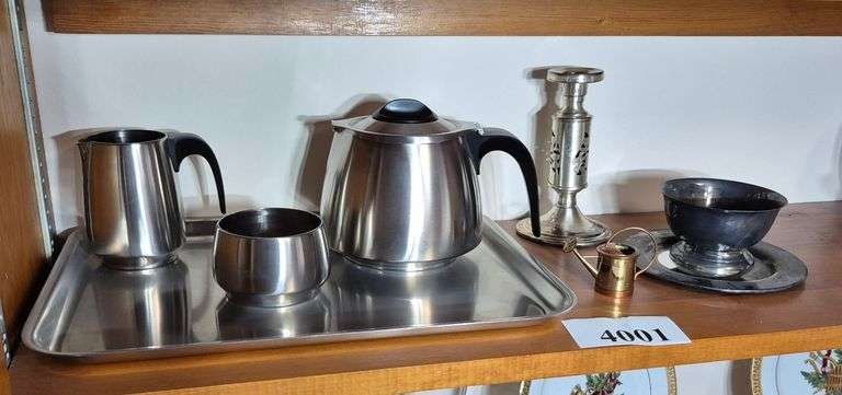 4001 Mid-century Chrome tea set, Silver Plate bowl, plate, and candle holder, miniature brass watering can