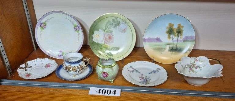 4004 Hand painted plates, Haviland bowl, cup and saucer, plate stands, etc.