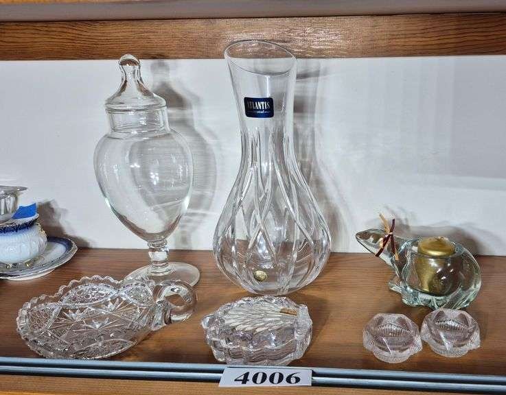 4006 Atlantis Crystal vase, covered candy dishes, bear votive candle holder, Pressed Glass nappy, etc
