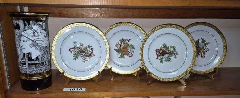 4010 Endre Szász black and white Hollóháza porcelain vase with gold trim, four Christmas plates with gold rims, four brass plate stands