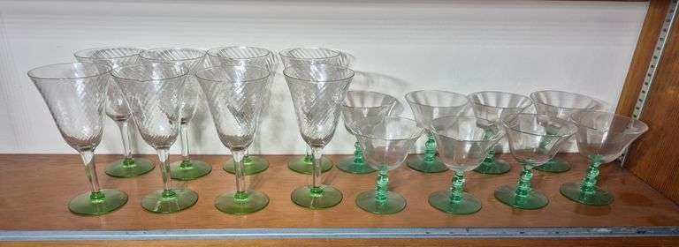 4024 Studio pottery vase, teapot, etched Emerald glass footed cup, souvenir jug, etched stemware