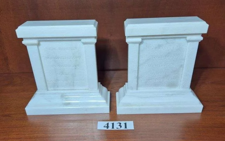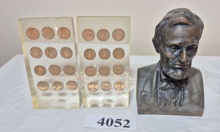 4052 Abraham Lincoln coin bank, pennies in a pair of lucite bookends