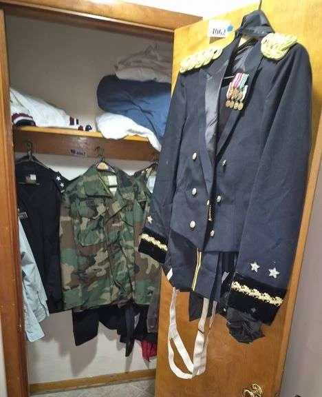 4300 Military uniforms, suits, coats, sweaters, scarves, blankets, two empty clothing bags.