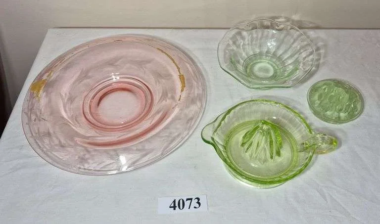 4073 Pink depression etched console bowl, green depression juice reamer, bowl, and flower frog
