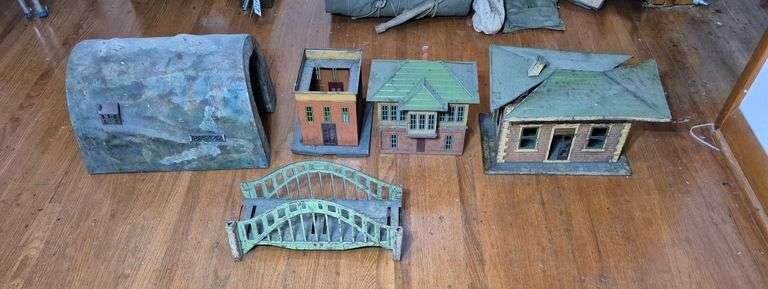 4234 Metal buildings, bridge, and tunnel used with Lionel standard gauge train set