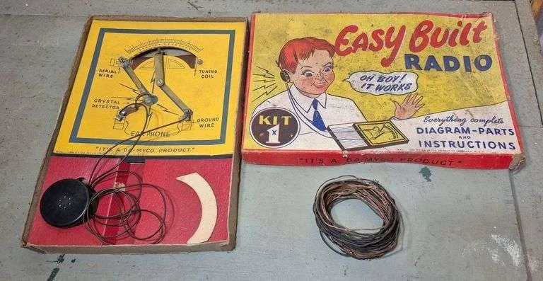 4270 Antique Da-Myco easy build radio kit in box with about a mile of antenna wire