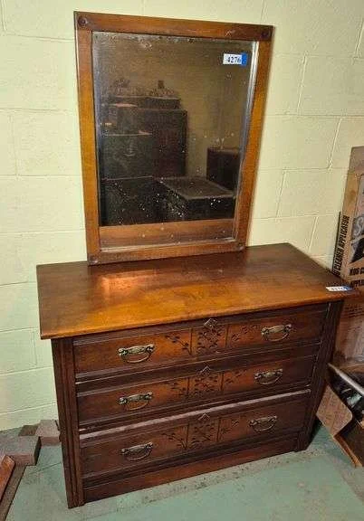 4276 Victorian three drawer dresser with spoon carved drawer fronts, wall hanging mirror