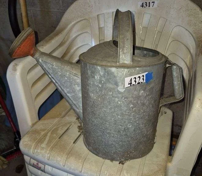 4326 Three galvanized trash cans, plastic trash can, cart, two new wheels that I assume Were Meant to replace the ones on the cart, yard waste bags