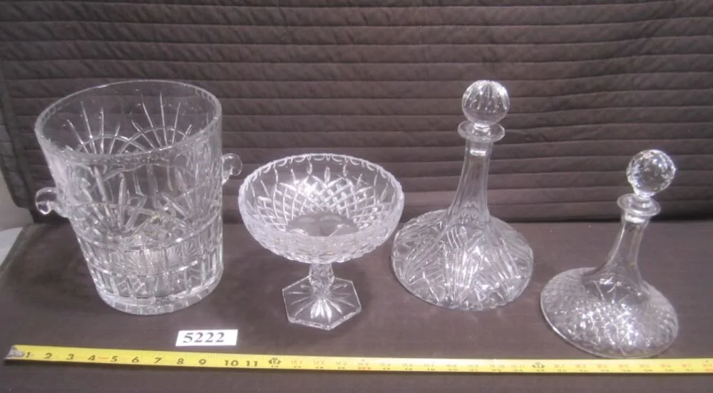 5222. (2) crystal decanters with stoppers, crystal ice bucket, crystal compote.