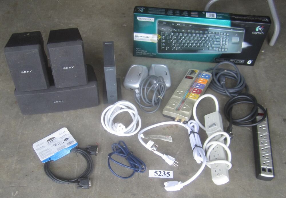 5235. Wireless keyboard for PS3 sealed in box, Sony speaker system, router, power strips, cables, etc.