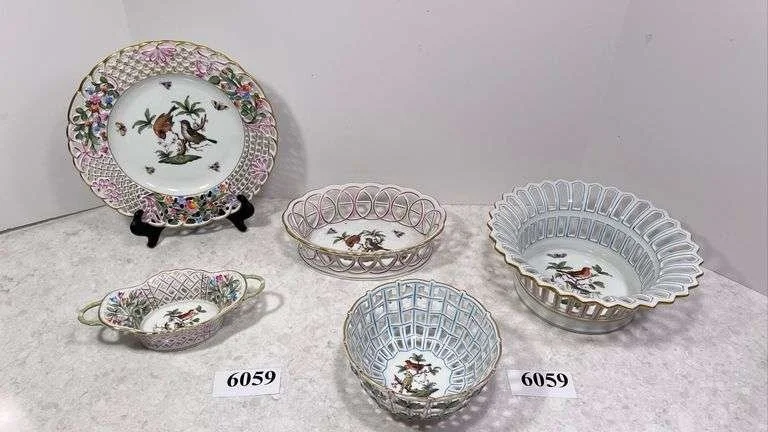 6059 Herend Hungary Rothschild Bird hand painted openwork decorative plate and four basket bowls