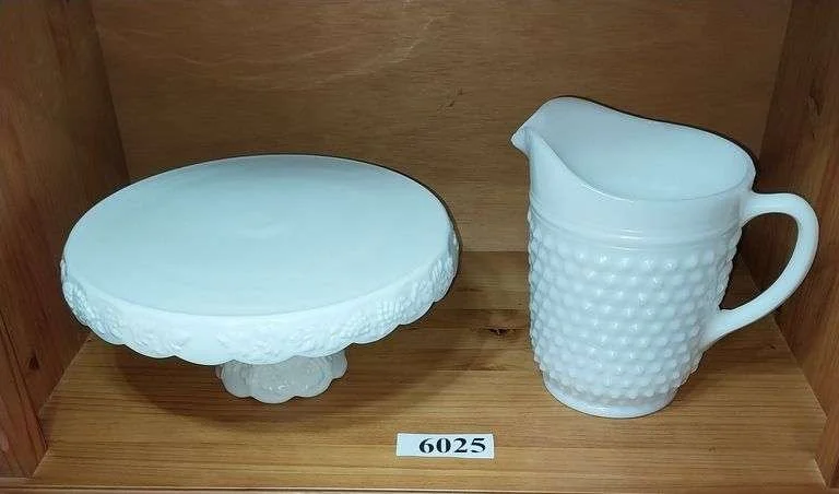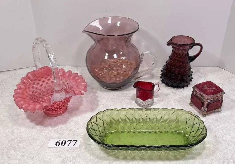 6077 Fenton? cranberry hobnail basket, Empoli Italy amethyst purple hobnail pitcher, Indiana Glass...