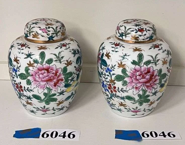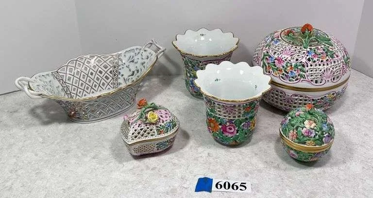 6065 Herend Hungary porcelain basket, Three bonbonniere / potpourri boxes with lids, Pair of...
