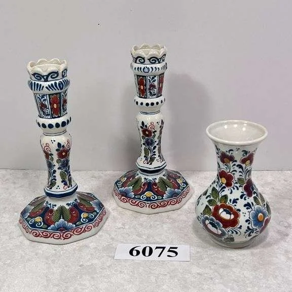 6075 Oude Dutch Delft polychrome candlestick set and matching bud vase made in Holland