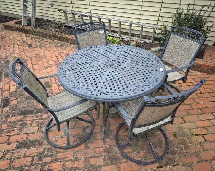 6214 Hampton Bay aluminum round patio table and four spring armchairs with concrete umbrella stand