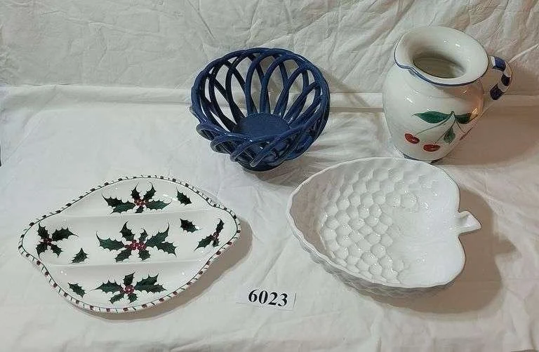 6023 Ceramic pitcher, California Peach blue ceramic bread basket, white strawberry bowl, Christmas holly...