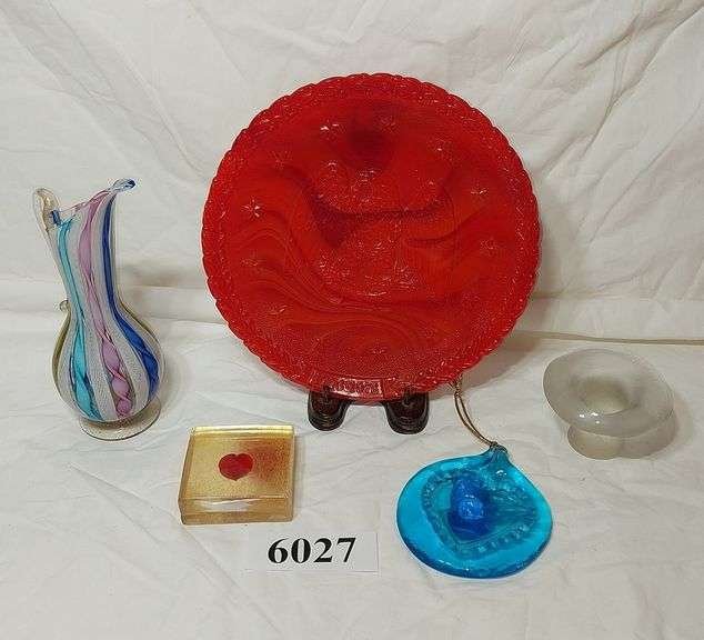 6027 Fenton plate with Daniel Webster quote, art glass pitcher, Murano Venezia heart in glass square...