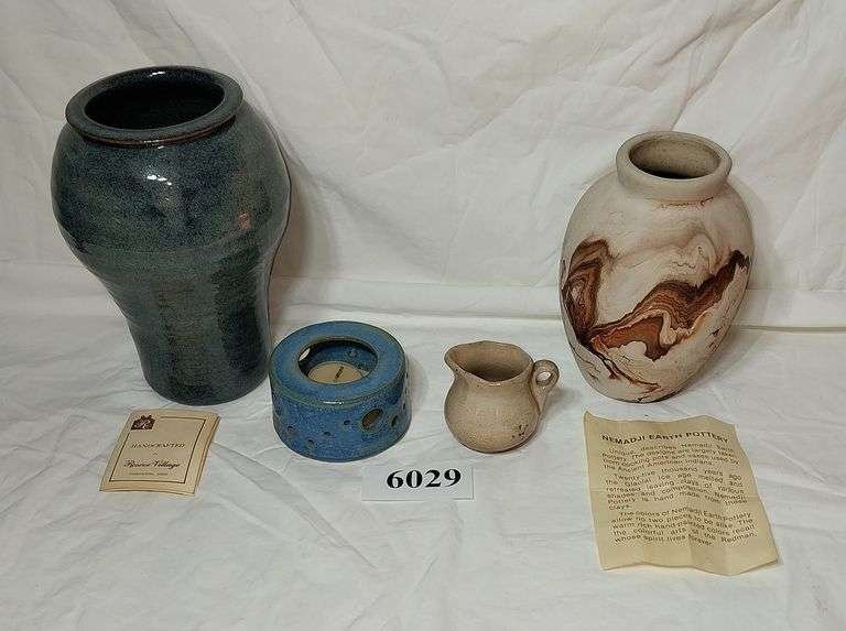 6029 Roscoe Village and Nemadji pottery vases, antique? small pitcher, Louis Mulcahy Ireland tea light candle holder