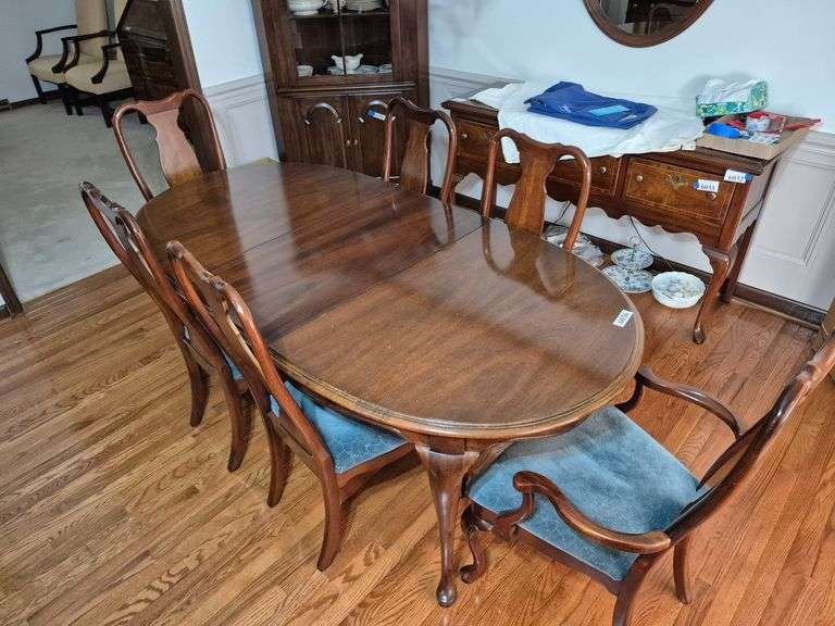 6036 Oval dining table with two armchairs, four straight chairs, two leaves