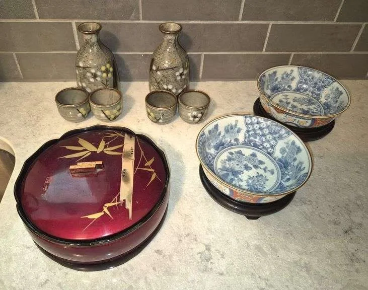 6039 Asian round lacquer box with buttons, pair of Andrea bowls with wood pedestals, two sake sets