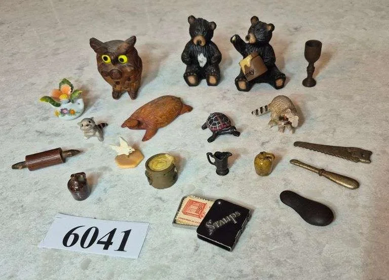 6041 Miniature animal figurines, tools, stamp holder, Etc