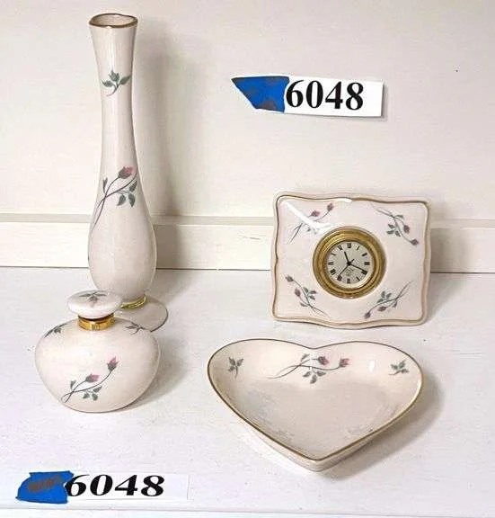 6048 Lenox “Rose Manor” heart dish, battery-operated clock, perfume bottle with...