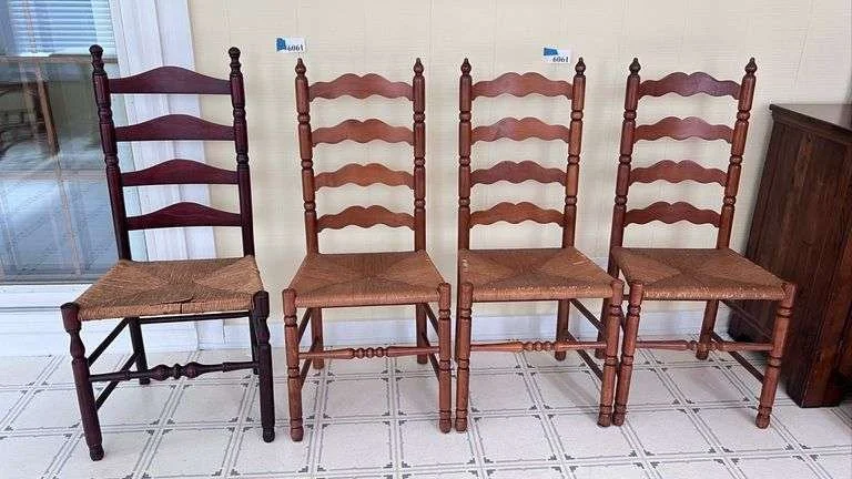 6061 Set of four matching Tell City Rush Seat Ladderback Maple Colonial Dining Chairs, One Antique...