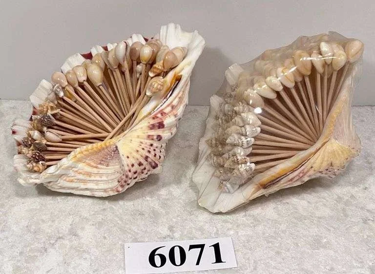 6071 Vintage seashell cocktail picks in matching seashell holders handcrafted in the Philippines