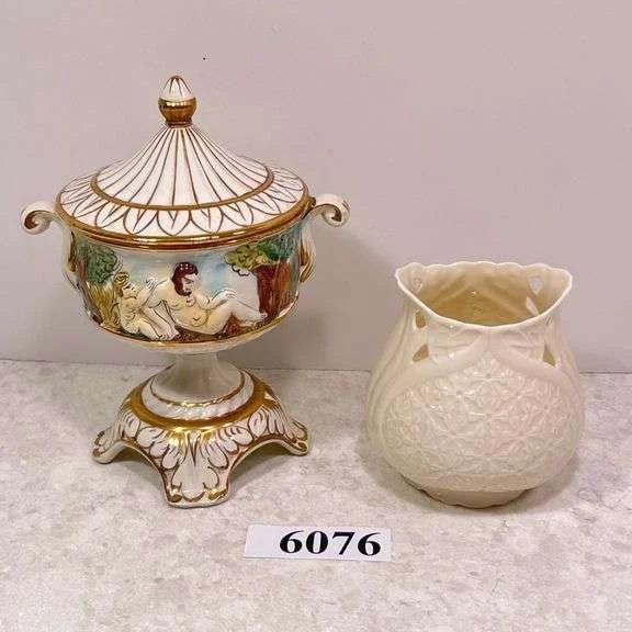 6076 Belleek Ireland Parian China Snowflake Vase, Keramos Capodimonte Italy porcelain lidded pedestal urn