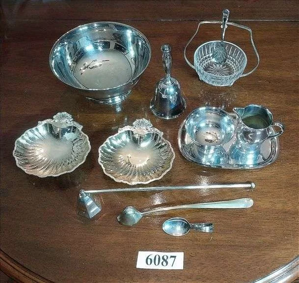 6087 Silver Plate bowl, two shell bowls, bell, condiment holder with glass bowl, Paul Revere reproduction tray and creamer, Sugar Bowl, two candle snuffers, and baby spoon