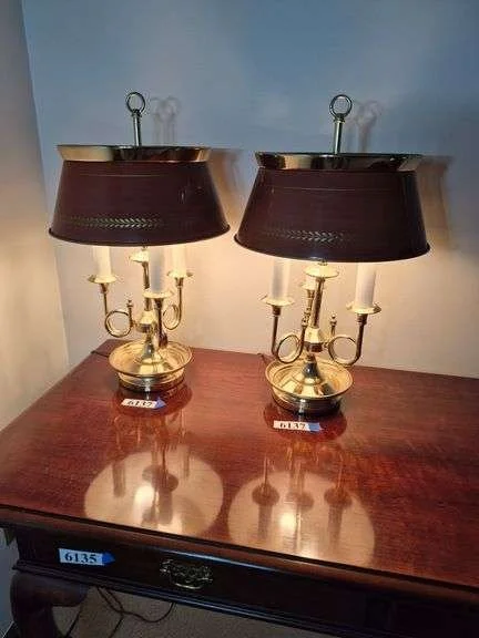6137 Pair of brass three-way lamps with metal tol painted shades