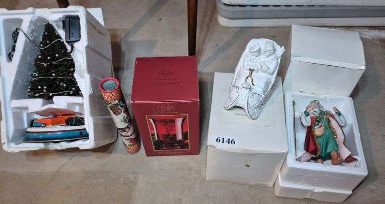 6146 Lionel rotating Christmas tree decoration, Lenox Musical slay, Lenox father christmas, Lenox red glass hurricane, etc.