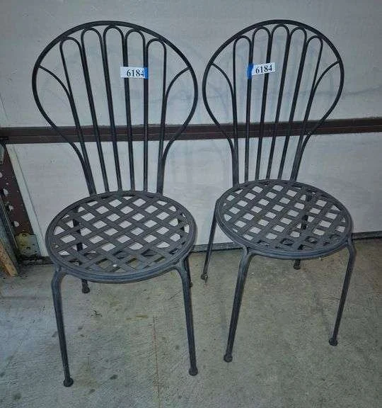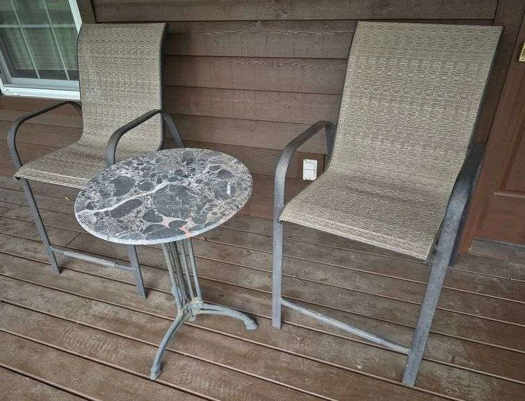 6219 Two aluminum patio stools, round Stone top metal base table, small glass top square folding outdoor table