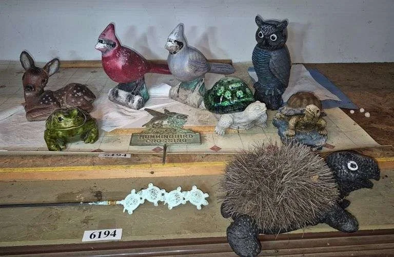 6194 Garden decorations including ceramic frog, concrete deer and cardinals, metal hummingbird Crossing and turtles, plastic Turtles and owl