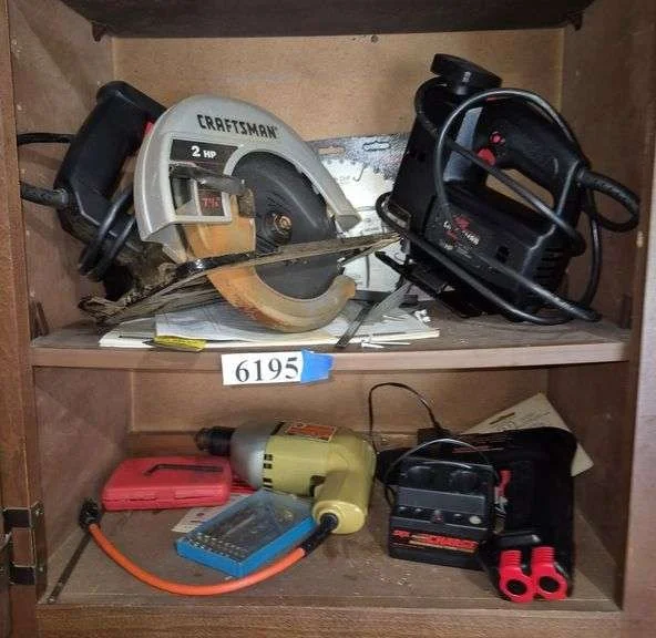 6195 Power tools including Craftsman circular saw and jigsaw, Skil cordless drill with charger, Black & Decker drill with bits