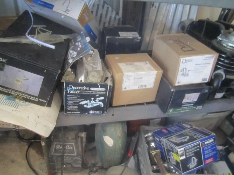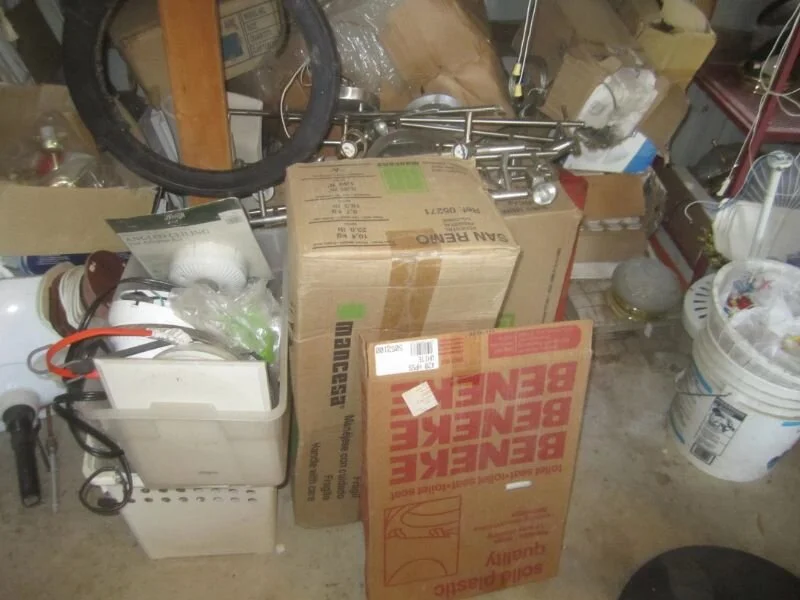 Building materials, appliances, etc. including numerous doors (pre-hung and loose), windows, shower enclosures, trim, lumber, tile, linoleum, plumbing fixtures and supplies, many lighting fixtures, ceiling fans, door lock and knob sets, electrical boxes & wiring, roof vents, garage doors & track, aluminum siding & facia, corrugated metal, small water heater, blinds, stainless double sink, disposals, pumps, 2 stainless and 1 white dishwasher; Side by side and top-freezer refrigerators; Dorm refrigerator; Gas stovetop; Gas range; Electric range; Several over-range microwave ovens; Central AC unit; Several window AC units;