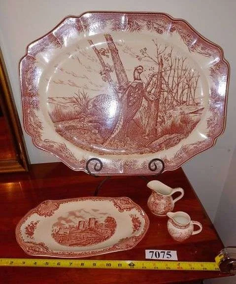 7075 Red and white transfer pheasant platter, Tower serving dish, two small creamers
