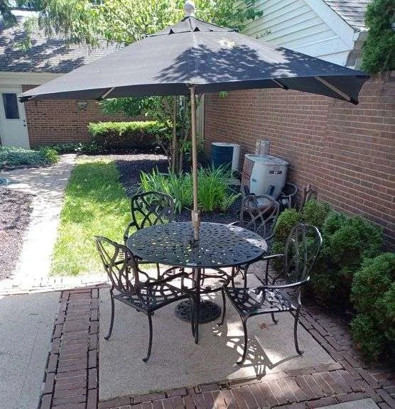 7149 Metal round patio table and 4 chairs with new cushions and umbrella with stand