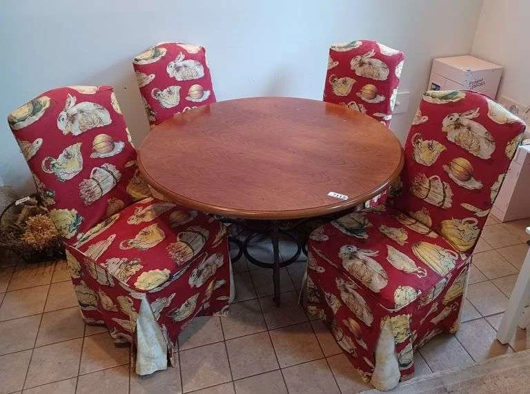 7115 Round dinette table with wrought iron base and 4 chairs with bunny fabric
