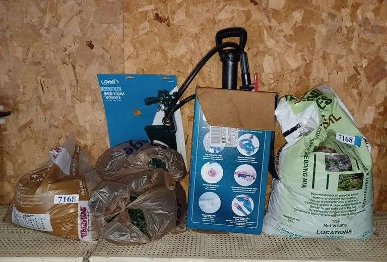 7168 Garden sprayer, sprinkler, Christmas lights, partial bags of sand and potting soil