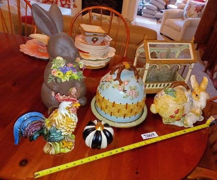 7069 Large covered dish majolica, bunny tureen, bunny & rooster figures, Christmas tree diorama, etc