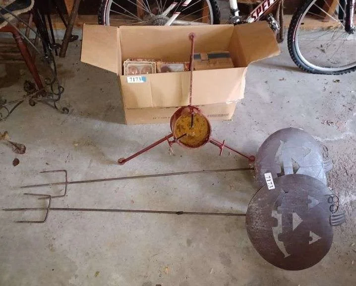 7173 Cast metal Christmas tree stand, Christmas ornaments, 2 metal jack o lantern candle stands