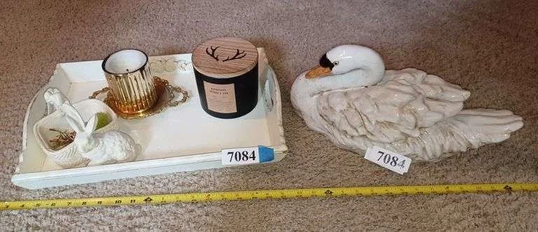 7084 Pottery Swan, wood tray, bunny planter, candles and candle holder