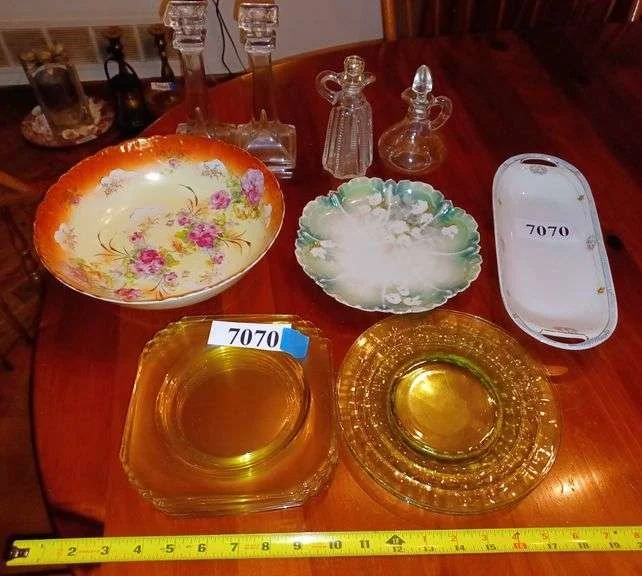 7070 RS Prussia plate, depression glass plates, cruets, candlesticks, etc.