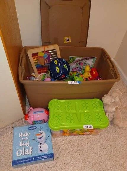 7130 Sesame Street toys, Frozen toys, other toys in tote
