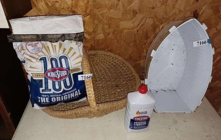 7166 Row boat shaped metal drink bucket, basket, full bag of charcoal, lighter fluid