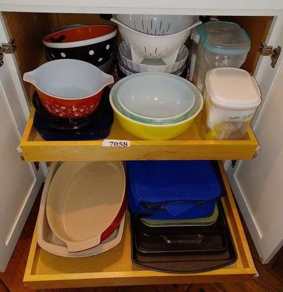 7058 Pyrex bowls, glass baking dishes, cookie sheets, cookbooks, etc.