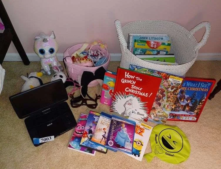 7003 Children's books, DVD player (no power cord), DVD's, dress-up items, plush toys