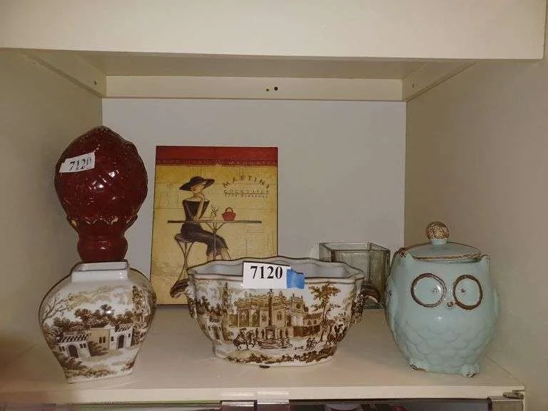 7120 Brown transfer bowl and vase, owl cookie jar, Martini print, vase, Etc